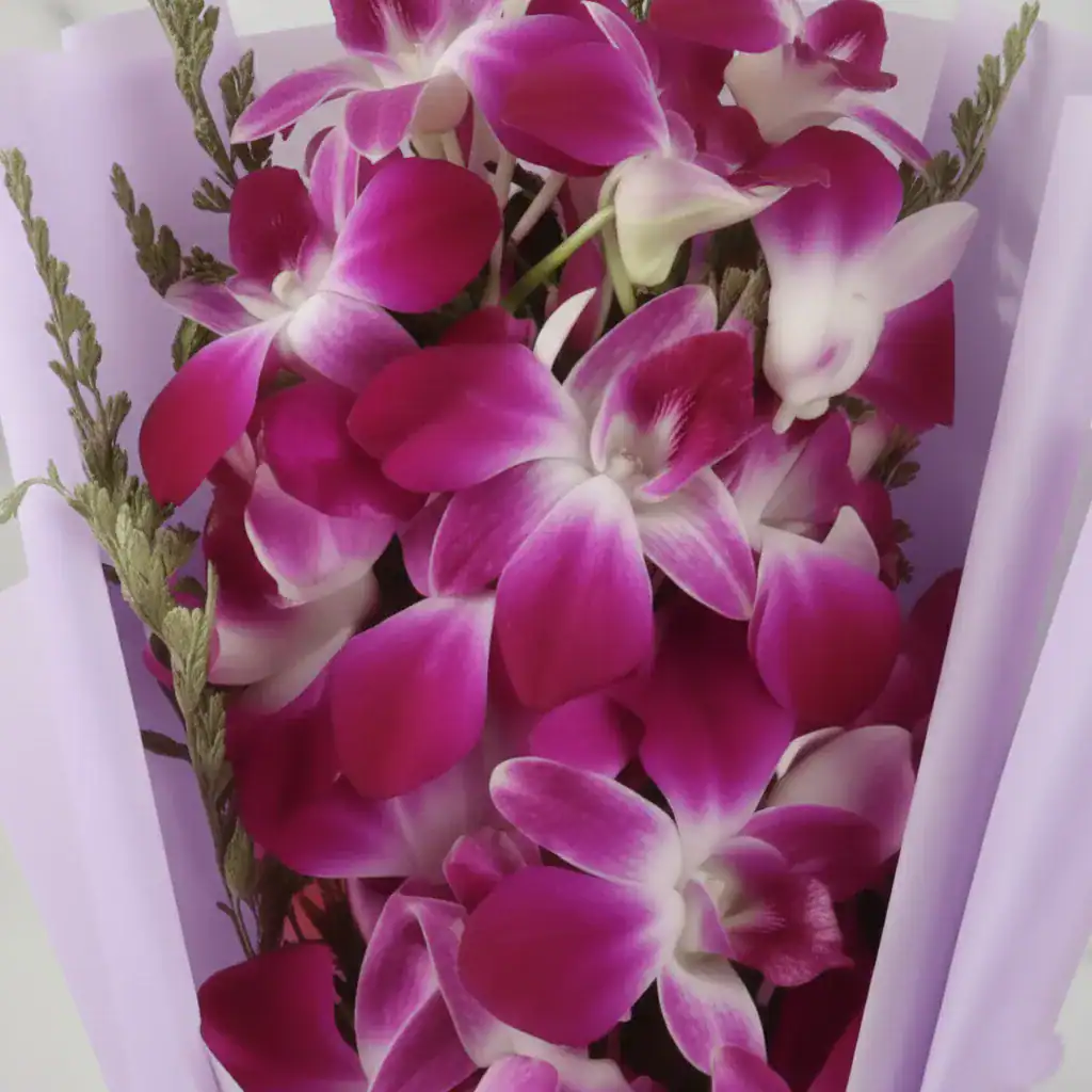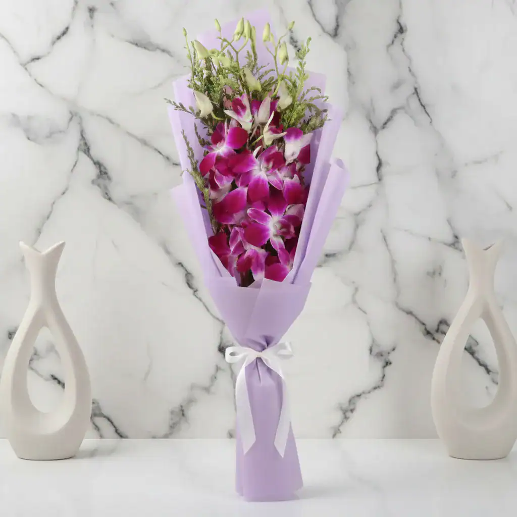 The arrangement is wrapped in premium paper that matches the blooms, creating a cohesive, monochromatic look. A crisp ribbon adds the final touch of sophistication, making this Purple Orchid Bouquet ready for any celebration.