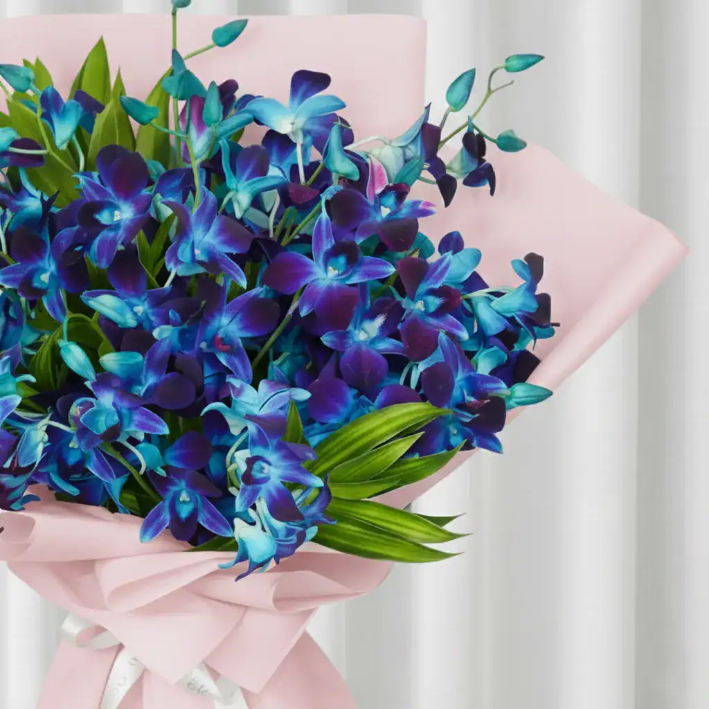 Expertly handcrafted at Gulmahal, this bouquet features ten long-stemmed Blue Orchid Flowers, known for their deep, mystical azure tones. As seen in the images, the electric blue petals contrast beautifully against the soft, pastel pink wrapping paper, creating a modern and photogenic aesthetic. Tied with a luxurious white satin ribbon, this Blue Orchid Bouquet is a masterpiece of color and elegance.