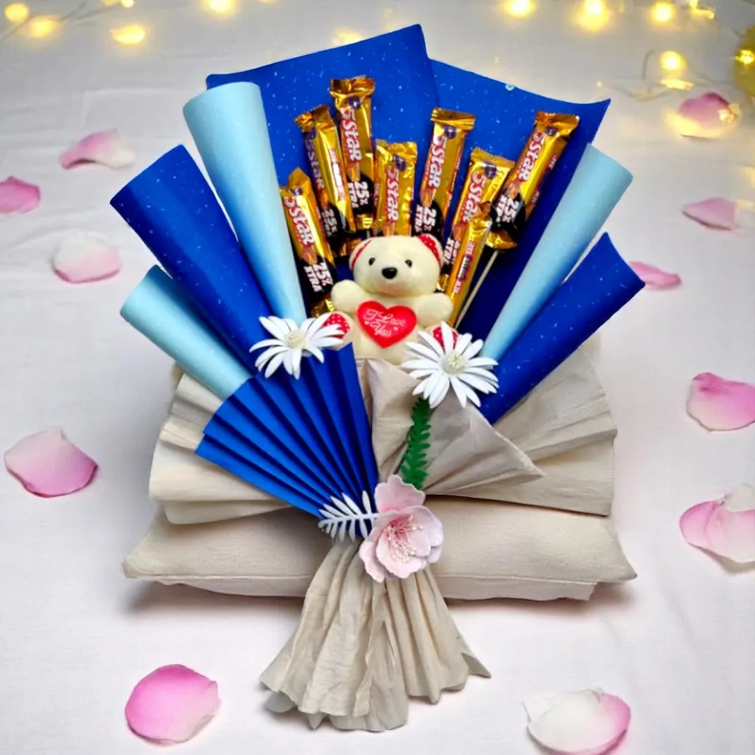 This delightful gift bouquet combines sweetness and charm in a stunning presentation. Featuring a collection of premium 5 Star chocolate bars, the bouquet is beautifully wrapped in an elegant blue and beige fan-style design. At the center, a lovable teddy bear holding a heart-shaped “I Love You” sign adds a romantic touch. Accented with dainty artificial flowers, this creative gift is perfect for birthdays, anniversaries, Valentine’s Day, or simply to express your love and appreciation. Treat your loved ones to this thoughtful and delicious surprise.