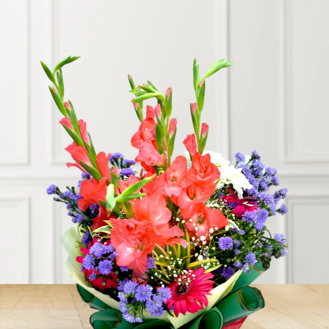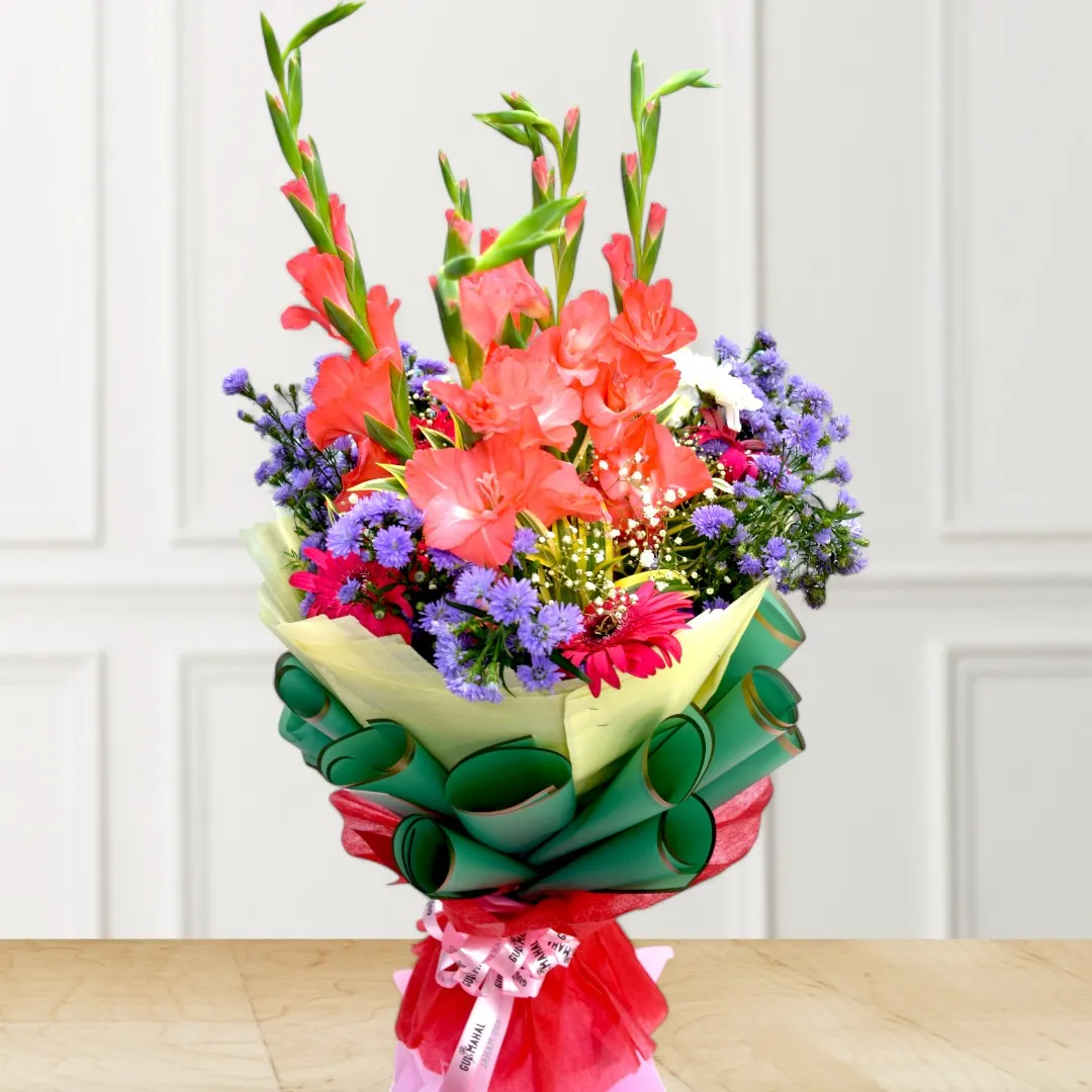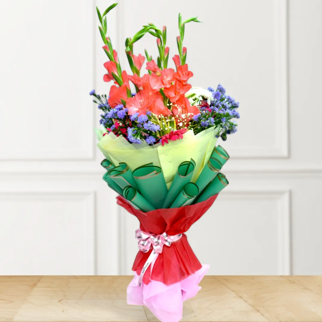 Make any occasion memorable with this elegant mixed flower bouquet, featuring vibrant gladiolus, delicate chrysanthemums, and a burst of colorful asters. Expertly wrapped in a beautiful combination of green and red paper, this bouquet adds charm and sophistication to any celebration. Perfect for birthdays, anniversaries, or special events, these fresh flowers are handpicked to ensure long-lasting beauty and freshness. Whether you’re sending love to someone in India or celebrating a milestone, this floral arrangement is designed to impress. Its combination of soft and bold hues creates a visually stunning bouquet that will leave a lasting impression. Surprise your loved ones with this perfect blend of flowers, ideal for expressing emotions of joy, love, or gratitude. Order now for reliable flower delivery in any place across India.