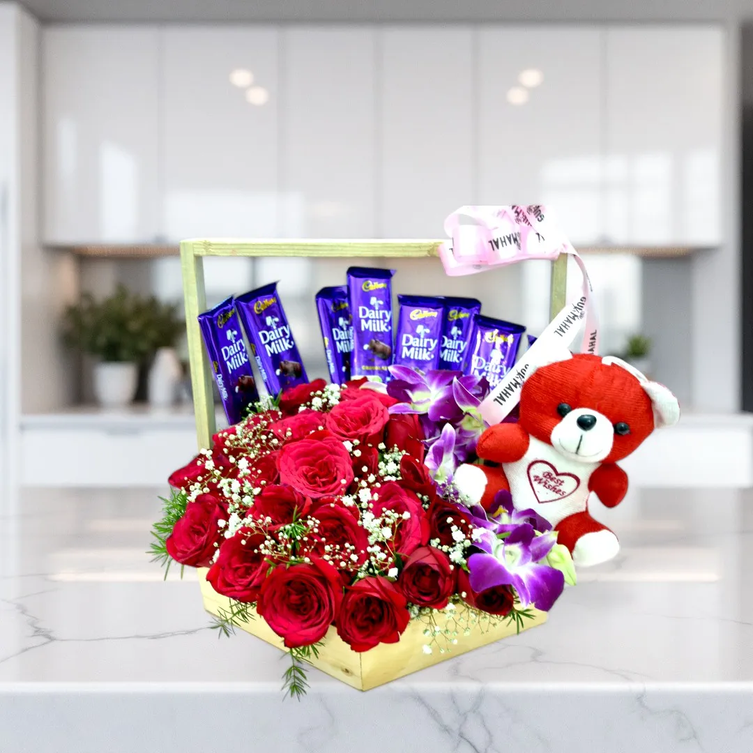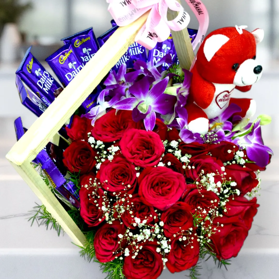 Bring joy to your special moments with this stunning flower basket, beautifully arranged with fresh red roses, vibrant purple orchids, and lush greenery. Perfectly crafted for any occasion, this delightful bouquet also features Dairy Milk chocolates, adding a sweet touch to your gift. A cute red teddy bear is included, making this flower basket an ideal present for birthdays, anniversaries, or special celebrations. The basket design makes it convenient to display, creating an elegant yet heartwarming gesture. Whether you’re sending love to friends, family, or colleagues in India, this charming bouquet delivers smiles and sweet memories. Our premium flower arrangements are made from the finest quality blooms, ensuring that your gift stays fresh and fragrant. Order now for prompt and reliable flower delivery across India.