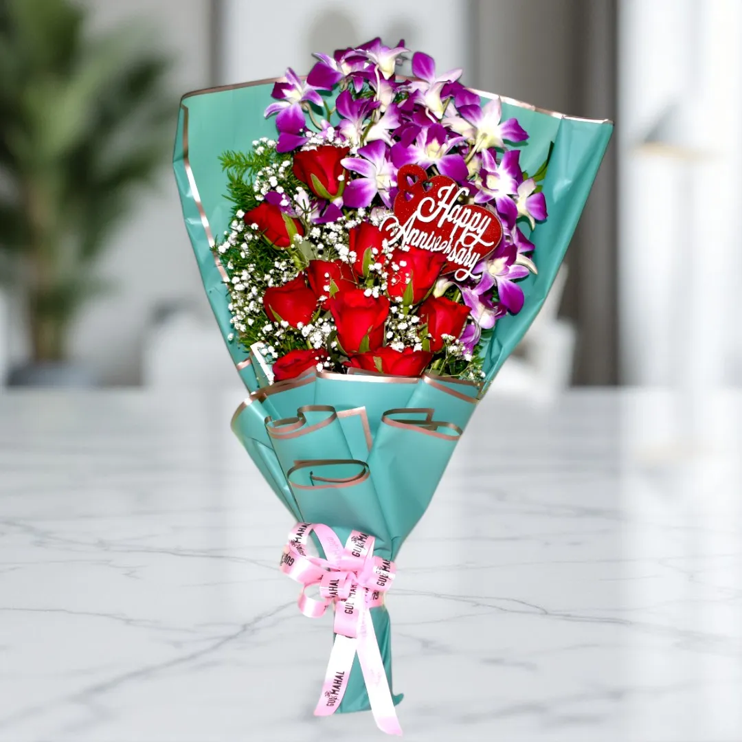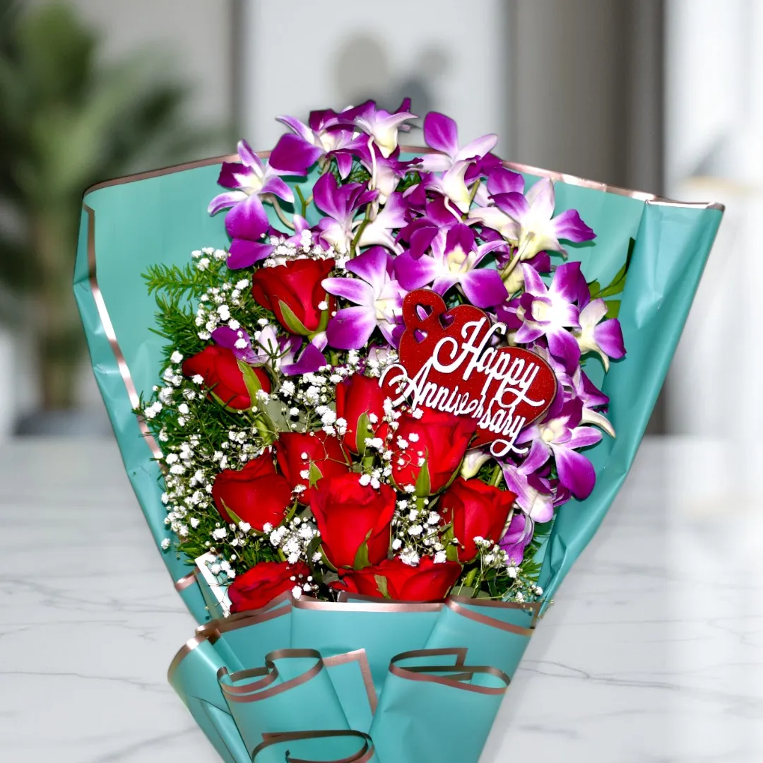 Indulge in the beauty of this exquisite mixed flower bouquet, a perfect blend of romance and elegance. The arrangement showcases a stunning combination of deep red roses and vibrant purple orchids, creating a captivating visual contrast. Delicate baby’s breath adds a soft, ethereal touch, while lush greenery provides a natural backdrop.