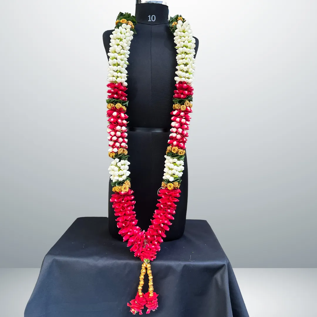 Jasmine & Petals Garland is a beautifully crafted flower perfect for celebrations and ceremonies. The garland is composed of white jasmine and vibrant red rose petals.