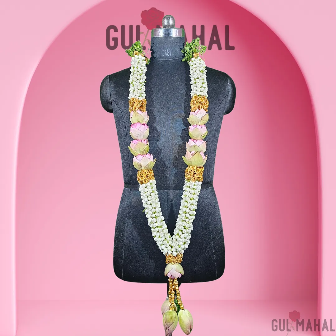 Perfect for weddings, engagements, and cultural ceremonies, this premium flower garland is designed to honor tradition while embodying elegance. The combination of delicate white jasmine and soft pink lotus blooms creates a stunning contrast that stands out in every moment.