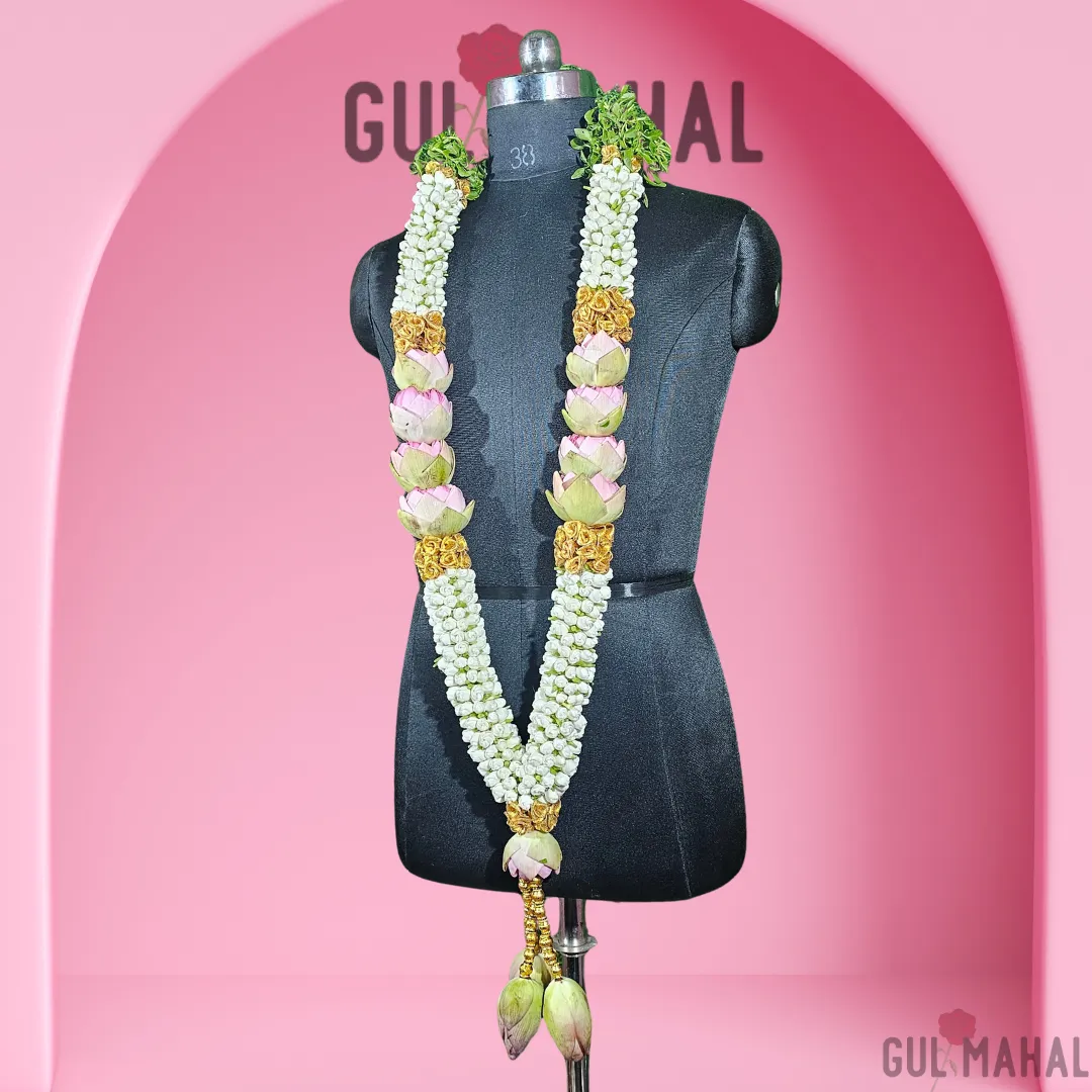 Elevate your special day with our Elegant Lotus Garland for wedding, a symbol of love and tradition. This Lotus Malai or haar is made with fresh Lotus flowers and Jasmine flowers to make wedding/marriage/shaadi, engagement or any important event extra special. Meticulously handcrafted with fresh jasmine buds, and vibrant lotus flowers, this exquisite varmala adds a touch of sophistication and charm to any celebration.