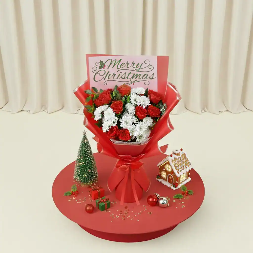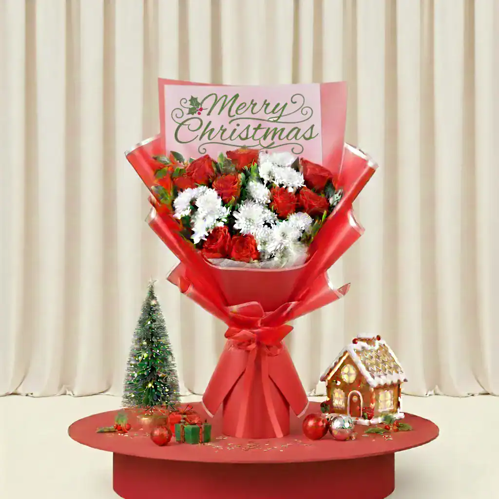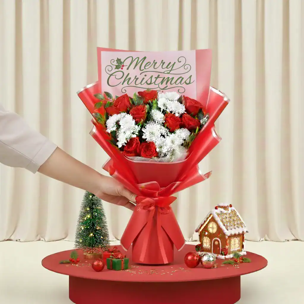 Spread holiday cheer instantly with our signature Merry Christmas Bouquet. This vibrant arrangement features premium scarlet roses and snow-white chrysanthemums, creating a classic winter contrast that embodies the spirit of the season. The bouquet is masterfully wrapped in a festive red-and-gold layered paper and comes with a beautiful “Merry Christmas” topper, making it a complete, gift-ready surprise.
