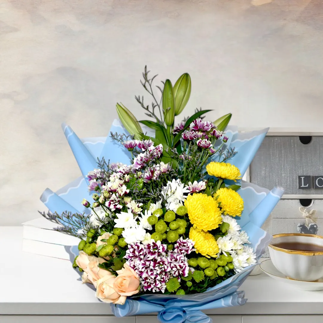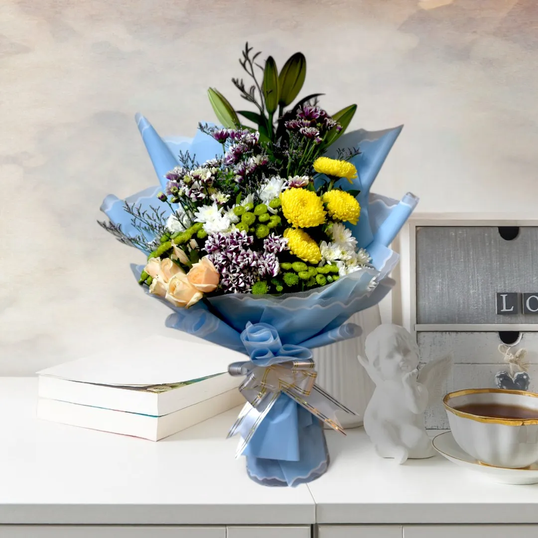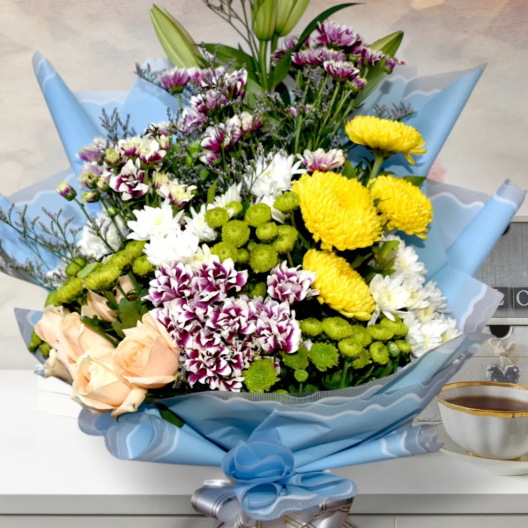 Presenting an elegant and vibrant flower bouquet, perfect for any occasion. This stunning arrangement features a delightful mix of flowers including yellow chrysanthemums, white and purple carnations, soft peach roses, and fresh greenery, all beautifully wrapped in a light blue paper. The delicate combination of colors and textures creates a bouquet that exudes elegance and sophistication.