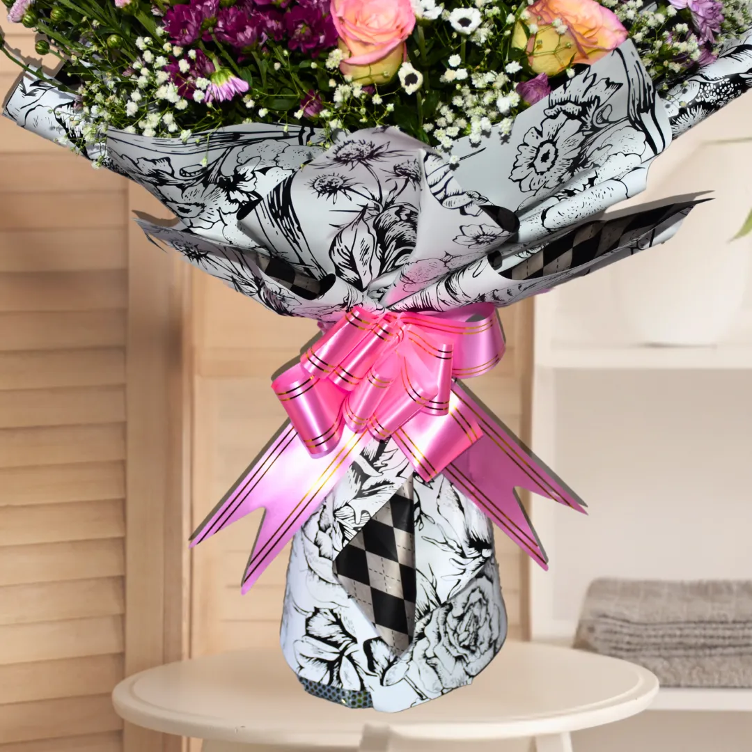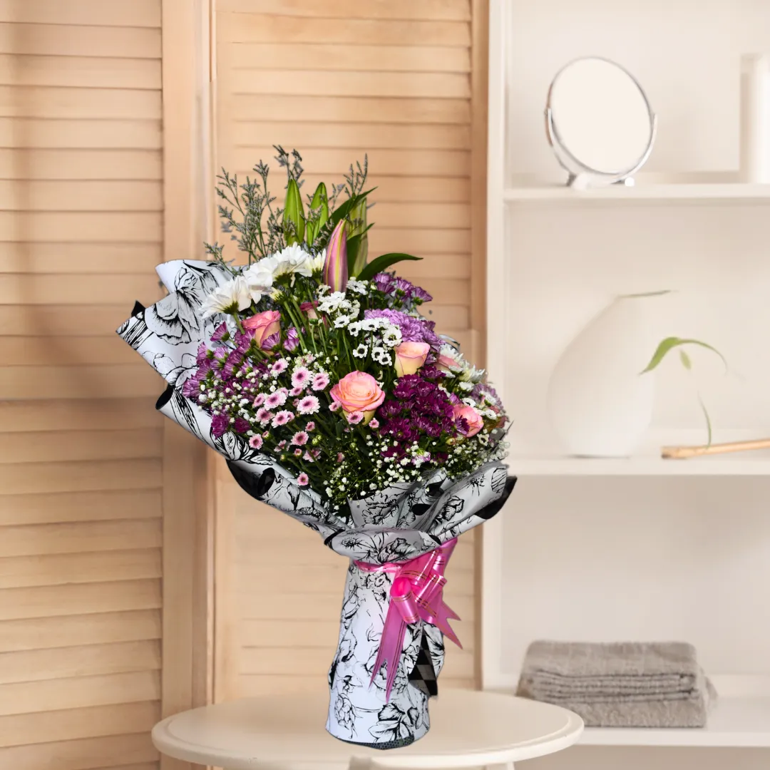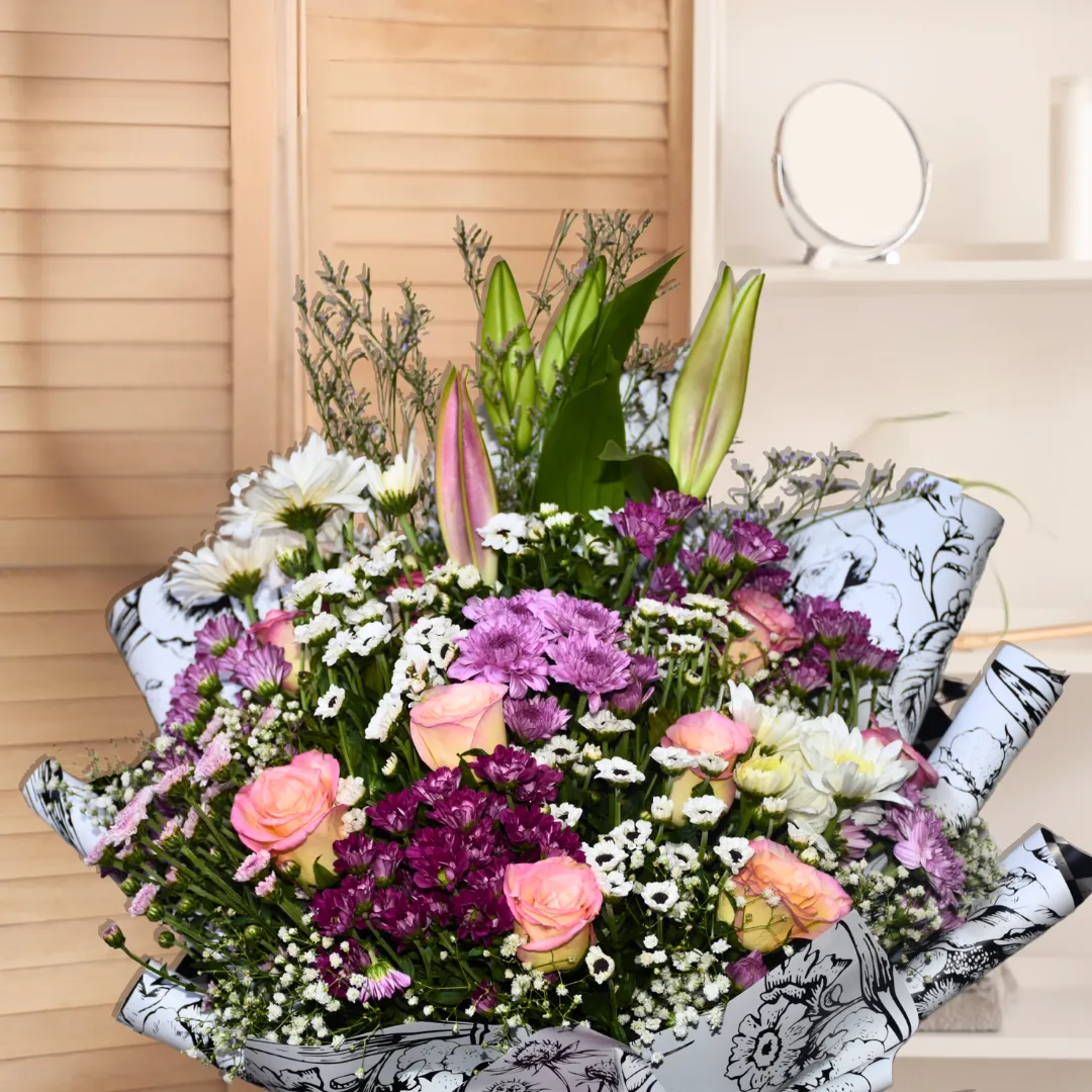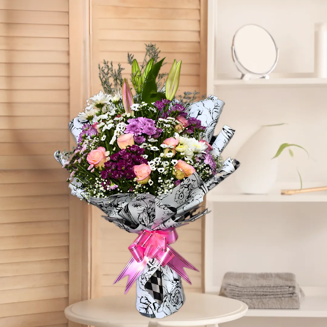 This stunning floral bouquet is a vibrant mix of fresh lilies, roses, and chrysanthemums, perfect for bringing joy to any occasion. Elegantly wrapped in stylish monochrome floral paper, this bouquet combines soft pastels with bursts of purple, creating a harmonious and luxurious arrangement. Whether you’re sending love, congratulations, or sympathy, this bouquet speaks volumes. Crafted with care, it features premium quality flowers arranged beautifully in a flower basket style. Available for delivery across India, this bouquet is sure to leave a lasting impression on your loved ones. Whether for birthdays, anniversaries, or other celebrations, you can rely on our flower delivery service to bring the freshest flowers straight to your door.