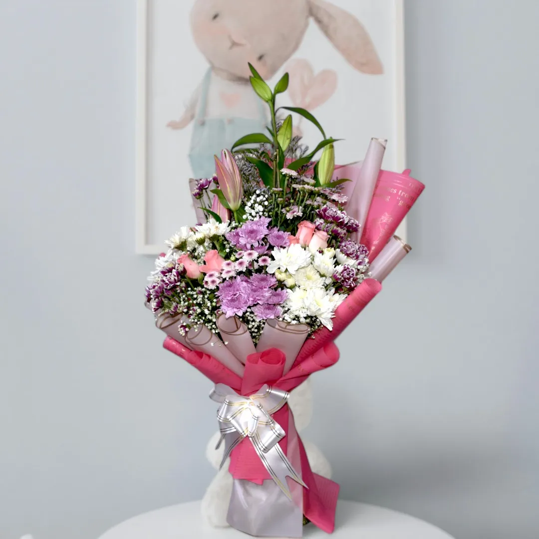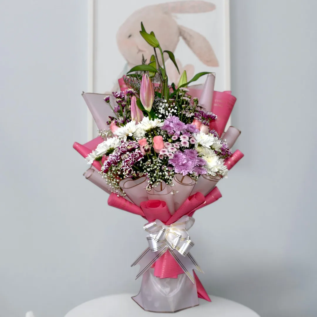 Brighten someone’s day with this elegant pink floral bouquet, a perfect choice for any occasion! This meticulously arranged bouquet features a beautiful assortment of fresh flowers, including lilies, carnations, chrysanthemums, and roses, all wrapped in vibrant pink paper. With a delicate balance of whites, purples, and pinks, it exudes sophistication and charm. Whether you’re celebrating birthdays, anniversaries, or just want to show someone you care, this flower basket is an excellent choice. Our fresh flower delivery service ensures your bouquets arrive in pristine condition, maintaining their freshness and vibrancy. Order this charming bouquet to make your special moments unforgettable. Ideal for gifting, our flower baskets are designed to impress.