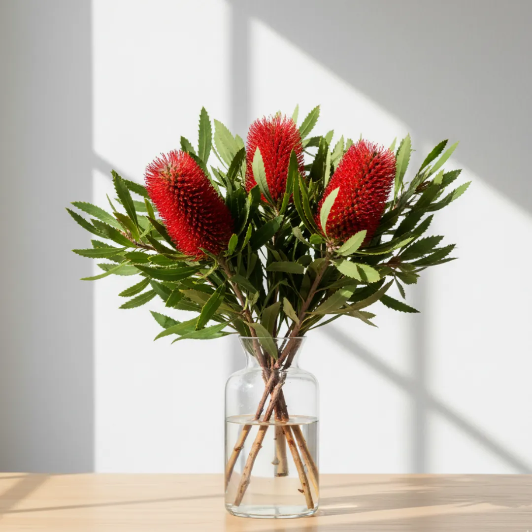 - Architectural Drama: The sheer size and upright shape of the Red Banksia make it a natural focal point. It creates a strong vertical line that draws the eye instantly, perfect for large entryways or corners.