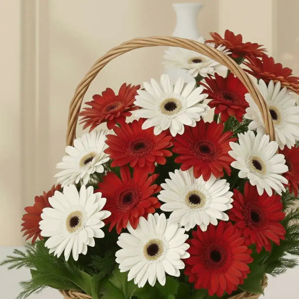 Brighten the holiday season with the unmistakable charm of our Red and White Gerbera Daisy Basket. Known for their large, daisy-like heads and vibrant petals, these fresh Gerbera daisies are hand-arranged in a classic wicker basket to create a display of pure joy and celebration. The striking contrast between the fiery red and crisp white blooms is softened by delicate emerald-green foliage, making it a standout piece for any room.