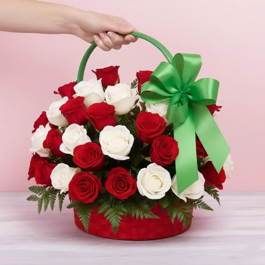 Experience the pinnacle of floral elegance with our Red and White Rose Basket, a masterpiece of seasonal beauty and sophisticated design. This lush arrangement features premium, velvet-textured red roses paired with pristine white blooms, artfully nestled in a vibrant scarlet wicker basket. To add a final touch of holiday magic, the basket is adorned with a striking emerald-green satin bow, creating a classic Christmas color palette that radiates warmth and luxury.