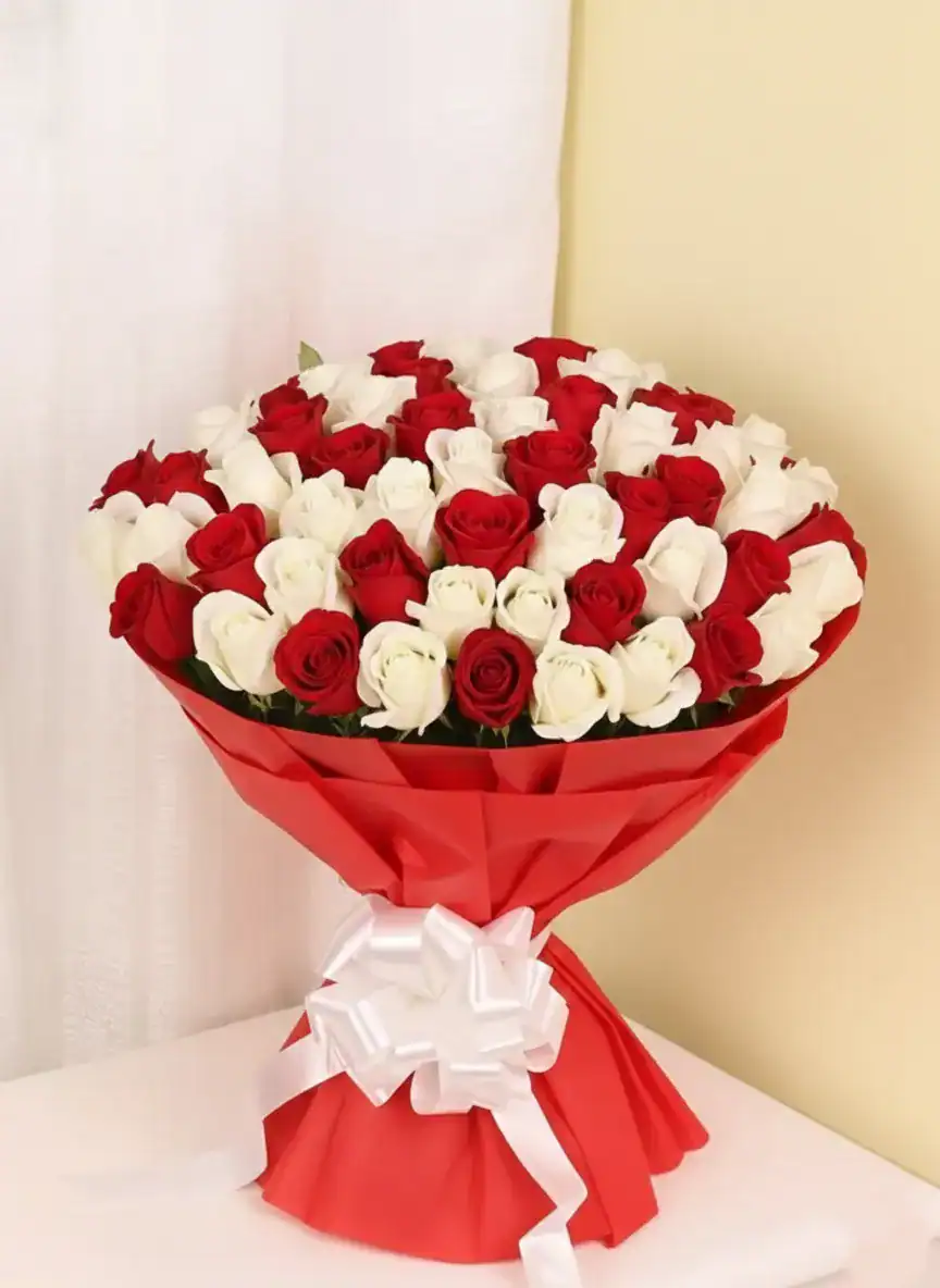 Make a bold statement with our stunning Red & White Roses Bouquet, symbolizing gratitude, appreciation, and elegance. The Red & White Roses Bouquet is perfect for any occasion whether it is birthday, anniversary, the Rose day, Valentine’s day, Christmas or even if they are just for you.