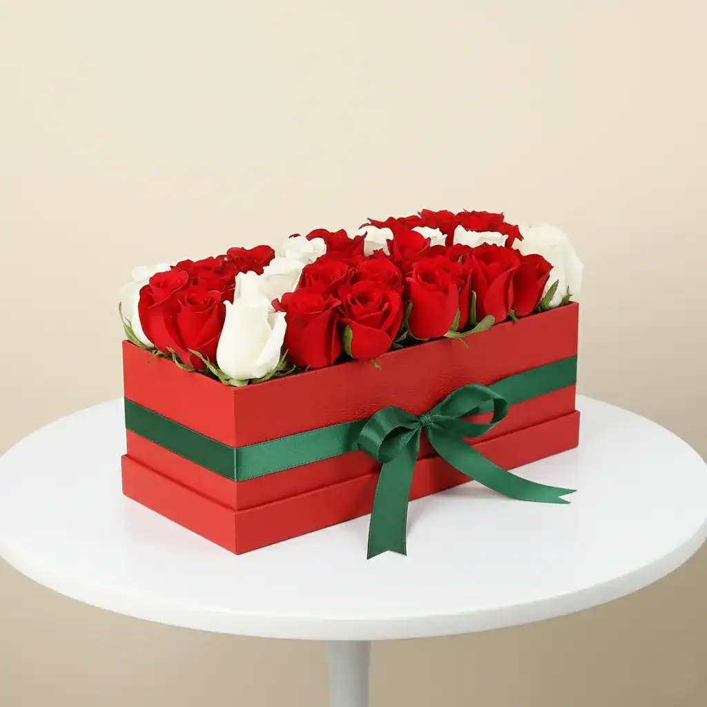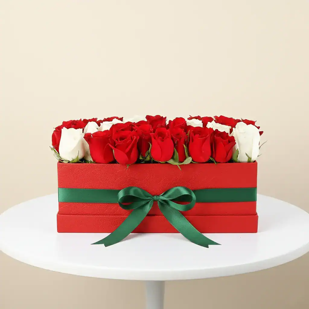 Make a statement of pure luxury this holiday season with our Red and White Rose Gift Box. This exquisite arrangement features hand-selected, velvety red roses paired with crisp white blooms, meticulously arranged in a sleek, rectangular signature red gift box.