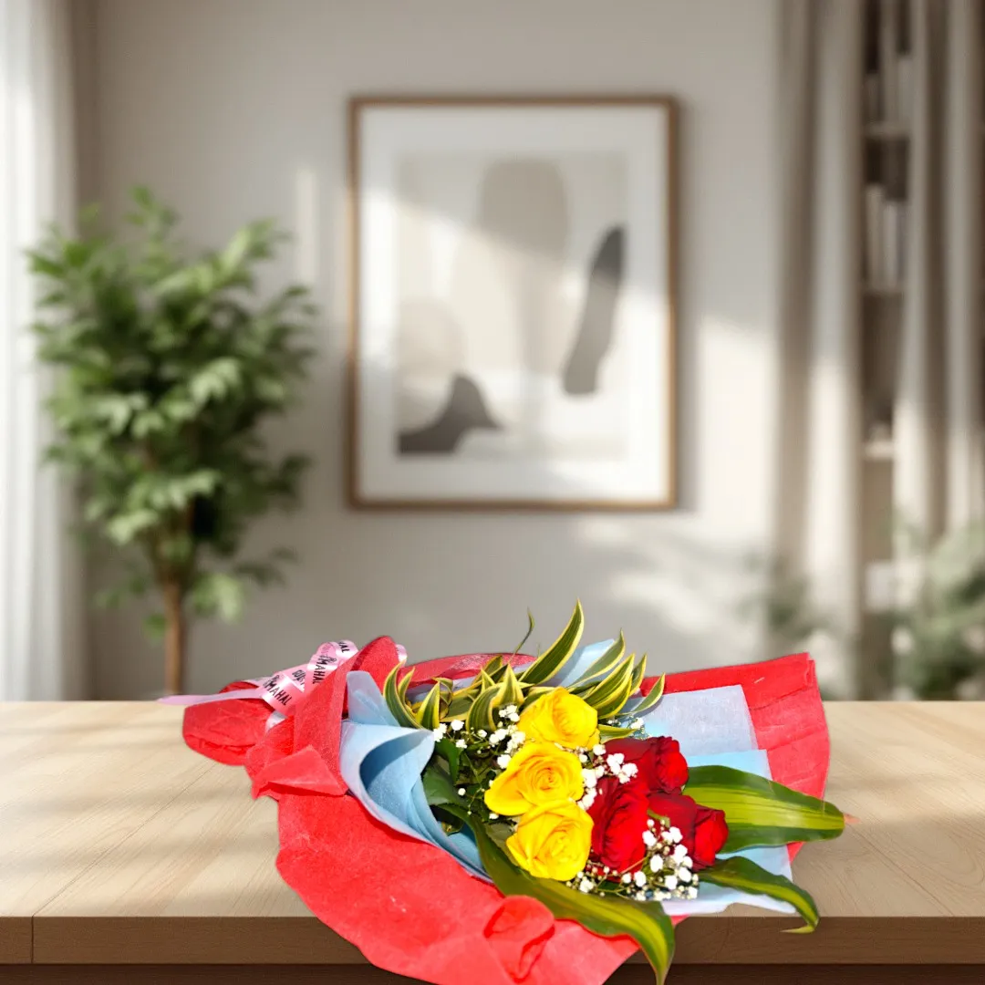 Brighten someone’s day with this charming flower bouquet. This delightful arrangement features a vibrant mix of red and yellow roses, accented with lush greenery and delicate baby’s breath. The flowers are expertly arranged and wrapped in a stylish combination of red and light blue paper, creating a visually striking presentation.