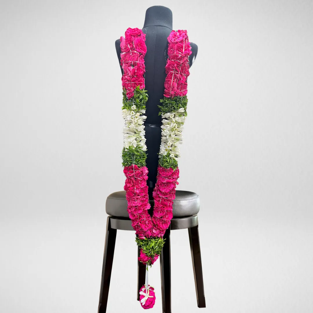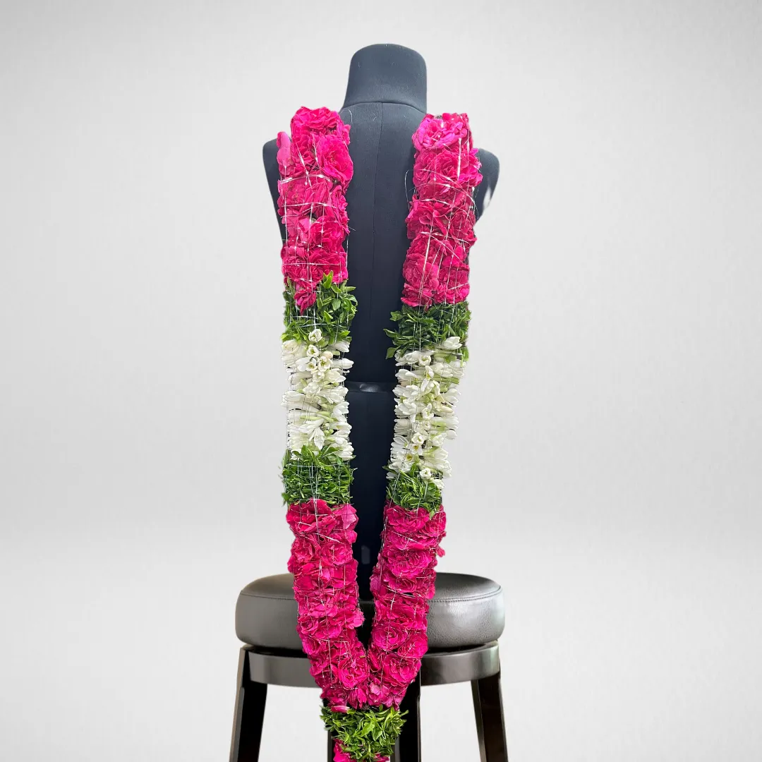 Adorn your special day with the timeless beauty of our Vibrant Pink Rose and Lily Garland. This deeply traditional Varmala features a stunning color-block pattern: the rich Pink Roses symbolize joy, happiness, and deep love, while the White lily represent purity, peace, and auspiciousness. The dense, bold segments, separated by fresh green foliage, create a spectacular, festive look.