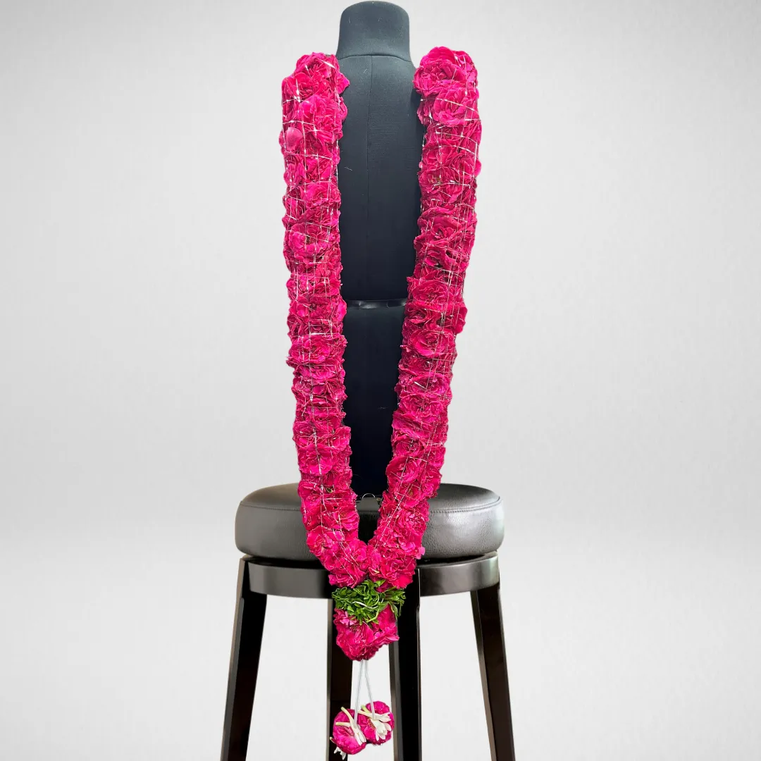 Celebrate your everlasting bond with our stunning Traditional Pink Rose Wedding Garland. This opulent piece is characterized by its dense, heavy weave of fresh, vibrant deep pink/magenta roses, creating a luxurious and uniform color statement. The rose, a universal symbol of love and joy, is deeply auspicious in Indian culture, making this garland the quintessential choice for a truly grand matrimonial ceremony.