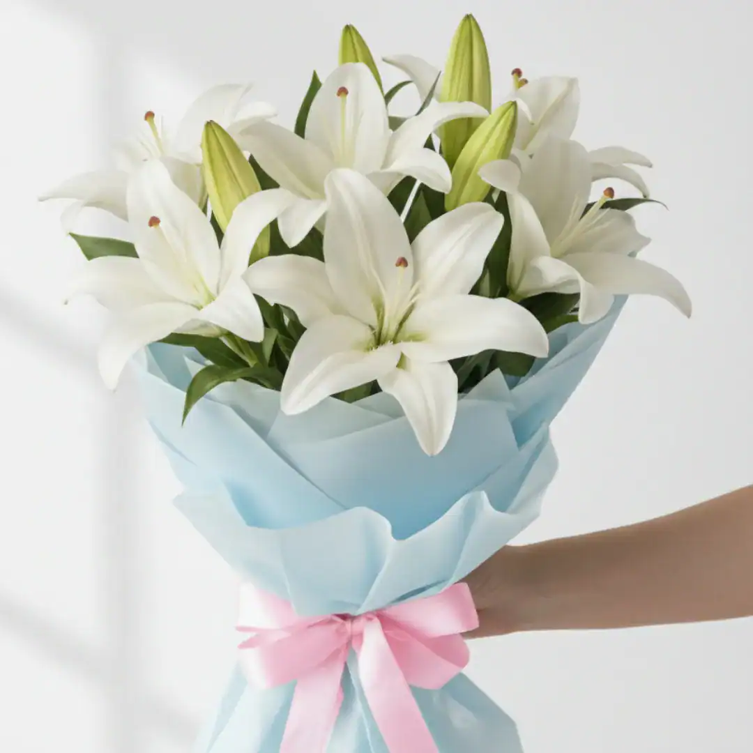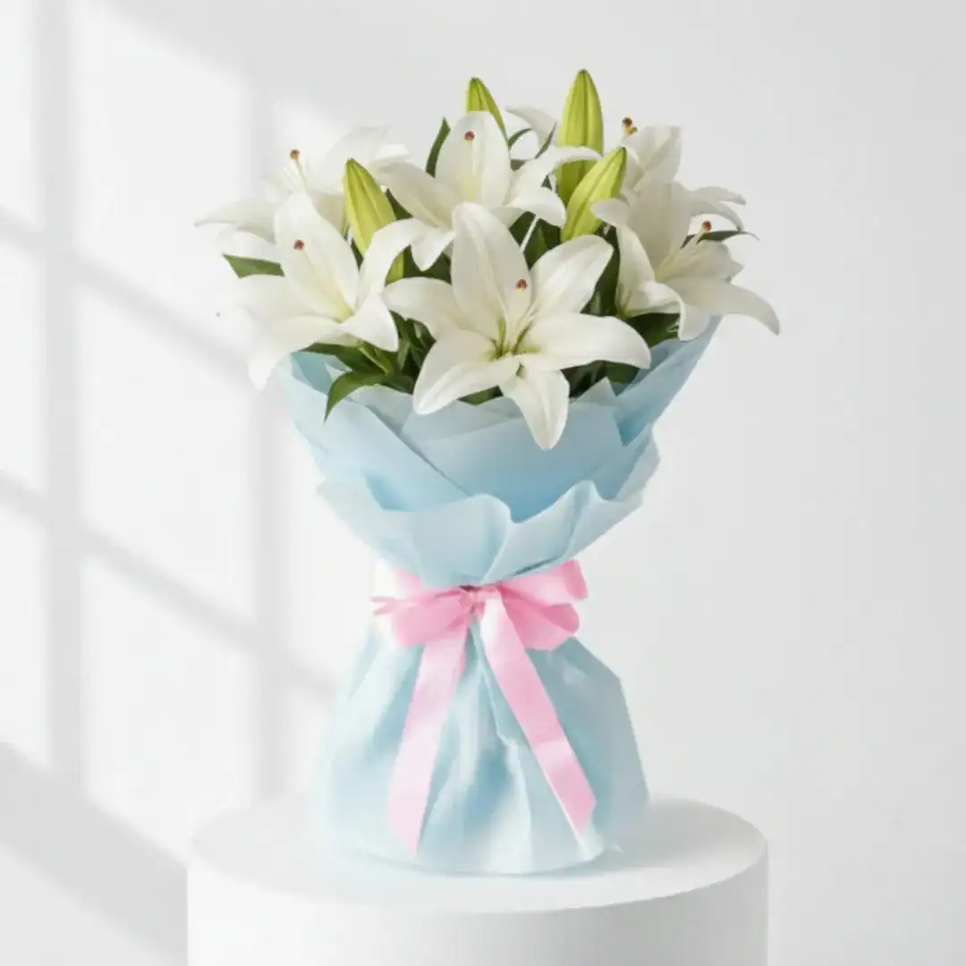 Deliver a gesture of timeless elegance, purity, and sincere reverence with our exclusive Pristine White Oriental Lily Bouquet. These premium, long-stemmed lilies are globally celebrated for their colossal size, immaculate white colour, and intoxicating sweet scent, guaranteeing an unforgettable ceremonial gift. The arrangement is expertly crafted for maximum pristine impact. Our bouquets are delivered professionally arranged and are the top choice for sophisticated events in Delhi, Mumbai, Chennai, and other cities.