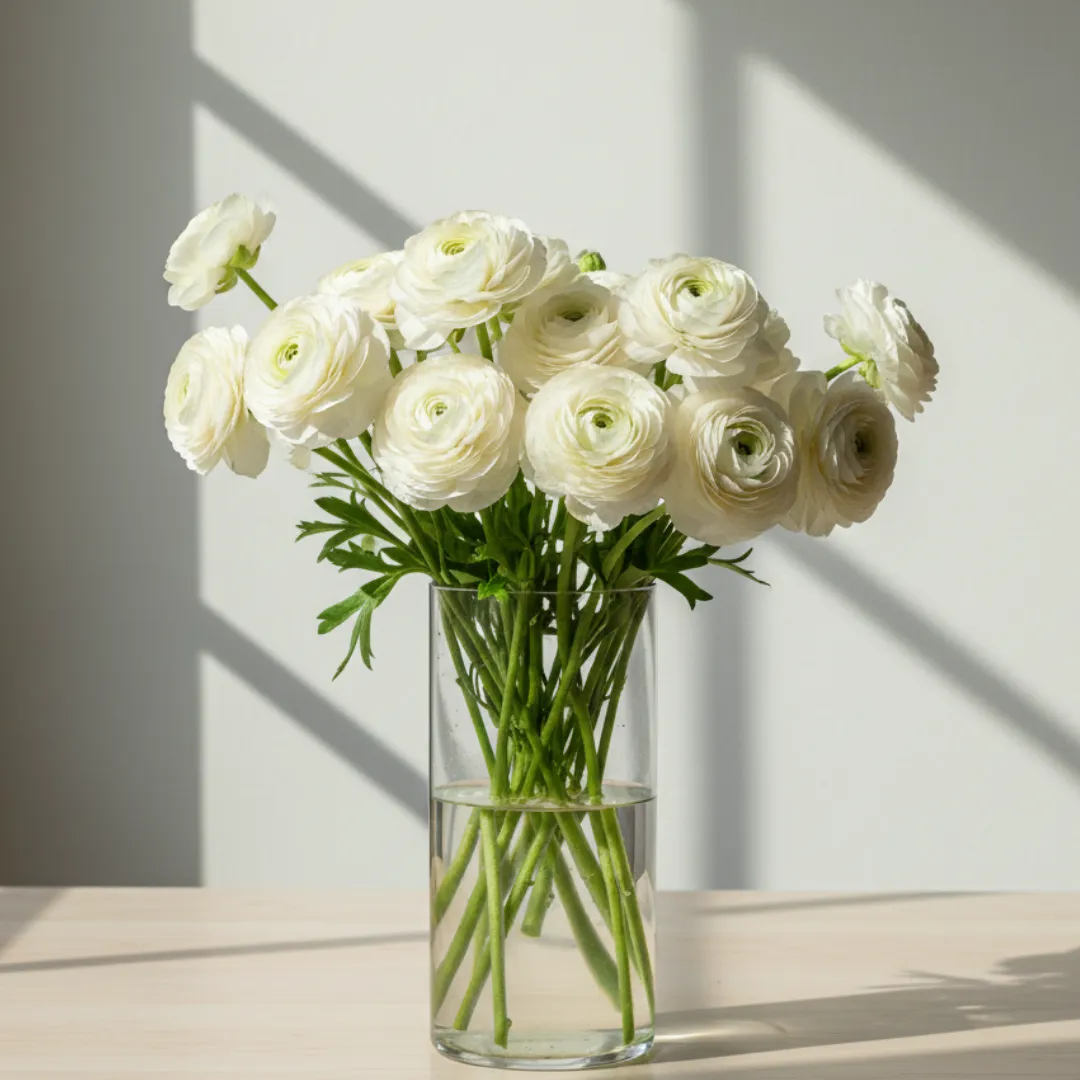 - Minimalist Masterpiece: A simple bunch of white ranunculus in a clear glass vase creates an instant modern, clean aesthetic. They don’t need fillers or greenery to look spectacular.